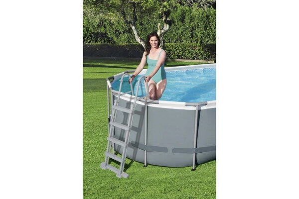 Der ovale Power Steel Pool kann mit einer Größe von ca. 549 x 274 x 122 cm mit maximal 13.430 Litern gefüllt werden und bietet so für mehrere Personen ausreichend Platz. Durch das spezielle TriTech Material des Herstellers ist der Pool belastbar, strapazierfähig und äußerst langlebig, so dass Sie viele Sommer den heimischen Badespaß genießen können. Das von außen, einmal komplett um den Pool gehende PVC-Band sorgt für extra Stabilität der Seitenwände. Mit im Lieferumfang enthalten sind neben der Filterpumpe, eine passende Filterkartusche, die benötigten Schlauchverbindungen, eine stabile Sicherheitsleiter, ein Chemikaliendosierer und ein selbstklebender Reparaturflicken.