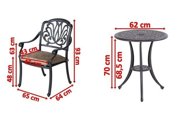 Die verwendeten Materialien sind extrem witterungsbeständig und pflegeleicht, weshalb das Bistro-Set auch bei schlechtem Wetter ohne Probleme auf Ihrer Terrasse stehen bleiben kann. Mit einem Gewicht von nur ca. 8 kg (Sessel) bzw. ca. 4,8 kg (Tisch) sind die Möbel zudem recht leicht, nicht zuletzt dank des stabilen Aluminiumgestells aber überaus standfest und stabil. Außerdem verfügt der Tisch über ein Schirmloch in der Mitte der Tischplatte, sodass Sie auch an sonnigen Tagen sorglos draußen sitzen können.