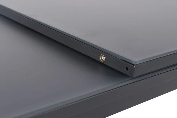 Seine besondere Optik verdankt er der Kombination aus der ca. 5 cm dicken Tischplatte aus Alu/Einscheibensicherheitsglas und dem anthrazitfarbenen Aluminiumgestell. Das ca. 5 mm dicke Sicherheitsglas überzeugt durch seine zahlreichen Vorteile und seine besondere Optik. Die geriffelte Tischplattenoberfläche sorgt dafür, dass das einfallende Licht nicht reflektiert wird und so ein matter Effekt entsteht. Der graue Siebdruck auf der Unterseite der Glasplatte sorgt für die graue Optik der Tischplatte. Das anthrazitfarbene Aluminiumgestell ist so hergestellt worden, dass es perfekt zu den anthrazitfarbenen Sesseln passt und die Artikel zusammen eine solide Esstischgruppe ergeben.