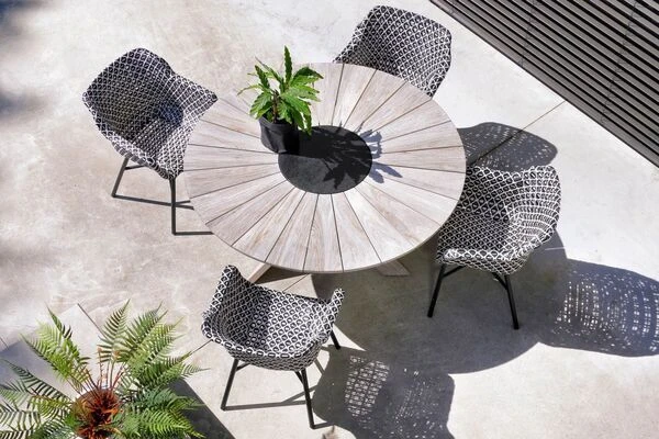 Hier treffen hochwertige Materialien und besonderes Design auf eine ausgefallene aber zugleich stilvolle Weise aufeinander. Der Tisch besteht aus hochwertigem, recyceltem Teakholz in der Farbe Light Grey und wertet mit seinem rustikalen Design das Gesamtbild Ihrer Sitzgruppe um einiges auf. Der Tisch bietet dabei mit seiner Größe von ca. Ø150 x 74 cm ausreichend Platz für 6 Personen. Das massive Teakgestell macht den Tisch besonders stabil und verfügt zum Schutz Ihrer Terrasse über Fußkappen.