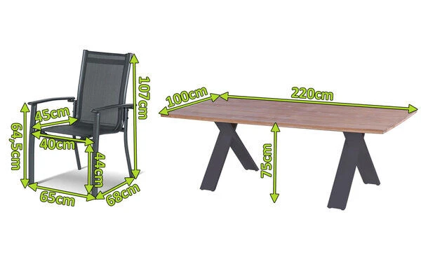Der Tisch mit dem gekreuzten Gestell ist gefertigt aus pulverbeschichtetem Aluminium in der Farbe Xerix (Anthrazit) und wird optisch perfekt durch die Tischplatte aus SVLK-zertifiziertem Teakholz ergänzt. Die Maße von ca. 220 x 100 x 75 cm sorgen dafür, dass stets ausreichend Ablagefläche zur Verfügung steht und bequem 8 Personen genügend Platz finden.