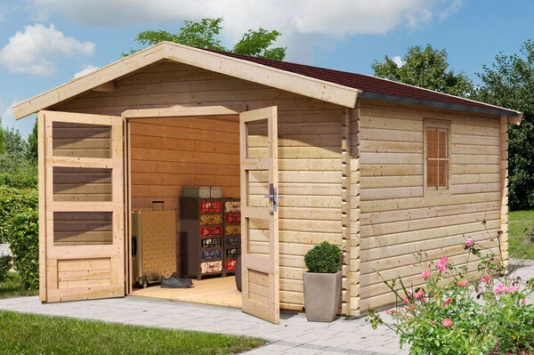 Das Blockbohlenhaus Meldorf 6 aus nordischer Fichte von KARIBU wird aus 38 mm Wandbohlen in klassischer Blockbohlenbauweise gefertigt und kann somit rasch und einfach aufgebaut werden. Bei der Blockbohlenbauweise werden die Wandbohlen reihum montiert. Begonnen wird mit einer halben, sprich unten glatten Bohle. Die patentierte 6-Plus-Eckverbindung sorgt dabei für höchste Wind- und Regendichtigkeit. Die Schraublöcher in den Blockbohlen sind werkseitig vorgefertigt und vereinfachen den Aufbau enorm. Das praktische Satteldach sorgt dafür, dass das Gartenhaus schnell und wirkungsvoll gegen Witterungseinflüsse geschützt ist. Zudem ist es optisch eine Augenweide. Der vordere Dachüberstand ist ausreichend groß dimensioniert, um den Eingangsbereich wirkungsvoll zu schützen. Das Haus hat eine Grundfläche von ca. 15 m² und ca. 31,3 m³ umbauten Raum. Dank der Seitenhöhe von ca. 199 cm und einer Firsthöhe von ca. 253 cm sorgt das Haus innen für viel Platz. Kesseldruckimprägnierte Bodenbalken sorgen für optimalen Schutz gegen aufsteigende Feuchtigkeit. Durch die Positionierung unter dem Gartenhaus schützen die Bodenbalken effektiv vor Staunässe und Spritzwasser. Das Gartenhaus wird mit einer Doppelflu¨geltu¨r aus Kunstglas im stabilen Massivholzrahmen ausgeliefert und bietet dank der großen Öffnung bequemen Zutritt in das Haus. Nebenbei bietet sie effektiven Schutz vor Diebstahl und ist mit einem Buntbartschloss mit zwei Schlüsseln ausgestattet. Gleichzeitig lassen die großzügigen Lichtausschnitte im jeweiligen Türflügel ausreichend Tageslicht in das Gartenhaus einströmen.