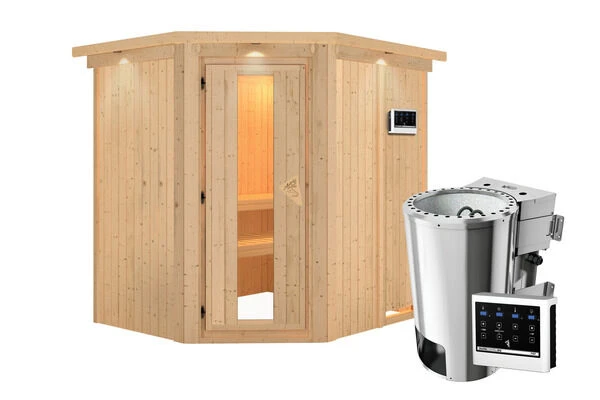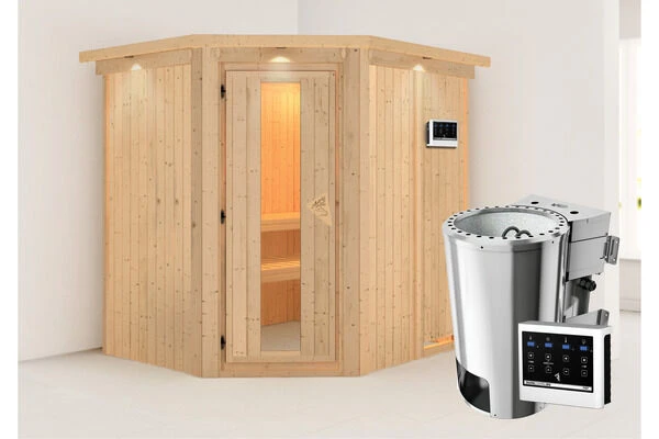 1x KARIBU 68 mm System Sauna Lobin mit Eckeinstieg und Dachkranz einschließlich Beleuchtung in verschiedenen Ausführungen inkl. Montageanleitung und -material