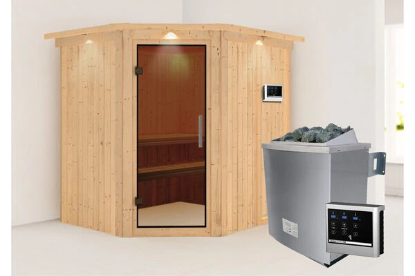 Sauna Siirin aus Fichtenholz mit Eckeinstieg inkl. Dachkranz in verschiedenen Ausführungen von KARIBU