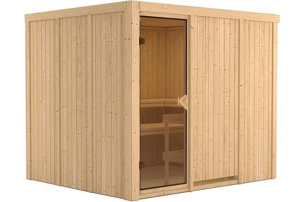 KARIBU Sauna Gobin mit Fronteinstieg und diversen Tür-, Ofen-, Steuerung- und Kranzoptionen
