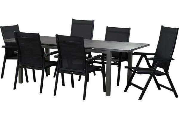 Das Zusammenspiel aus hochwertigen Materialien und zeitlosem Design ist maßgeblich kennzeichnend für dieses Gartenmöbel-Set aus dem Hause Kettler/Siena Garden. Das Set für 6 Personen besteht aus dem Ausziehtisch „Miros“ von Siena Garden mit den Maßen von ca. 180/240 x 90 cm, 4 Stapel- und 2 Multipositionssesseln aus der „Basic Plus“ Serie von Kettler.