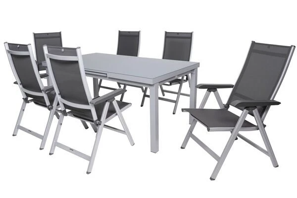 KETTLER BasicPlus Esstischgarnitur, silber, Alu/Textilene, OUTFLEXX Premium Premium Ausziehtisch 180/240x100cm, 6 Multipositionssessel