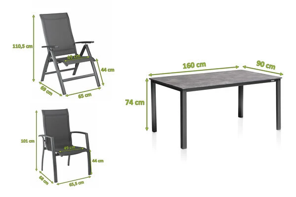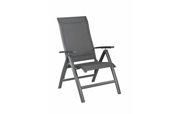 Der rechteckige Tisch für 4-6 Personen bietet Platz für eine ganze Familie. Die anthrazitfarbene Tischplatte besteht aus hochwertig verarbeitetem Kettalit und wird von einem soliden Gestell aus Aluminium in anthrazit getragen. Die positiven Eigenschaften von Aluminium sind zahlreich: Es ist leicht, wetterfest, stabil und elegant. In Kombination mit der Stabilität und der kratzfesten Oberfläche der Kettalit Tischplatte wird aus diesem Möbelstück das Highlight für Ihren Garten. Mit dem Stapelsessel aus der Legato Curve Serie mit den Maßen von ca. 68 x 65,5 x 101 cm bequem durch den Sommer. Das solide und formschöne Gestell besteht aus edlem, anthrazitfarbenen Aluminium. Die ebenfalls anthrazite Sitzfläche wird aus wasserdurchlässigem, hochwertigem Outdoorgewebe gefertigt. Die Sitzfläche nimmt kein Wasser auf und trocknet schnell, so können Sie auch nach einem kleinen Regenschauer rasch wieder Platz nehmen. Das luftige Gewebe ist formstabil und trotzdem sehr bequem und zusätzlich UV- und sonnenölbeständig – insgesamt also der perfekte Begleiter in Ihrem Garten. Die Sessel lassen sich aufstapeln – wenn sie nicht benötigt werden können Sie sie platzsparend verstauen. Der Multipositionssessel aus der Legato Curve Serie mit den Maßen von ca. 69 x 65 x 110,5 cm lässt sich mittels Rasterschiene leicht in 4 verschiedene Positionen bringen – so wird der Komfort eines Liegestuhls direkt integriert. Das solide und formschöne Gestell besteht aus edlem, anthrazitfarbenen Aluminium. Die ebenfalls anthrazite Sitzfläche wird aus wasserdurchlässigem, hochwertigem Outdoorgewebe gefertigt. Die Sitzfläche nimmt kein Wasser auf und trocknet schnell, so können Sie auch nach einem kleinen Regenschauer rasch wieder Platz nehmen. Das luftige Gewebe ist formstabil und trotzdem sehr bequem und zusätzlich UV- und sonnenölbeständig – insgesamt also der perfekte Begleiter in Ihrem Garten. Dank der leichten Materialien und des Klappmechanismus lässt sich der Stuhl leicht zu handhaben – wenn er nicht benötigt wird können Sie ihn platzsparend verstauen.