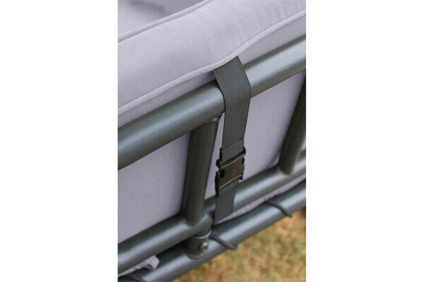 - Liege hängt frei schwingend an 4 Seilen zwischen dem Stahlgestell