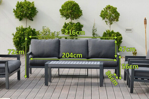 Für Ihre individuelle Gartengestaltung ist das 3-Sitzer Sofa (ca. 216 x 86 x 72 cm) auch einzeln erhältlich. Sie können ihn vielfältig kombinieren. Die Sitzflächen sind ca. 68 cm tief und kombiniert mit der gemütlichen grauen Sitzpolsterung aus Olefin (100 % Polyester) in einer Stärke von ca. 10 cm erhalten Sie höchsten Sitzgenuss und die Entspannung kommt fast von allein. Das Gestell ist aus stabilem Aluminium in der Farbe anthrazit.