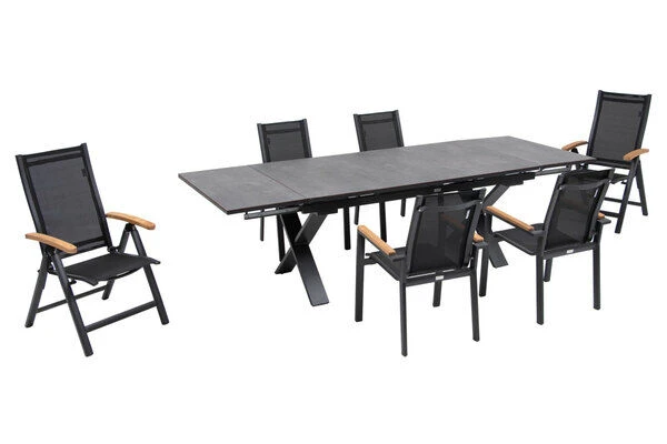 OUTFLEXX® Esstischgarnitur aus Aluminium/HPL/Textilene in schwarz, Ausziehtisch 180/280x100x78cm, inkl. 6 Stapel-/Multipositionssessel mit recyceltem FSC®-Teakholz