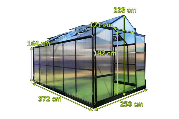 1x OUTFLEXX Gewächshaus aus pulverbeschichtetem Aluminium und Polycarbonat, schwarz, ca. 372 x 250 x 228 cm inkl. Montagematerial