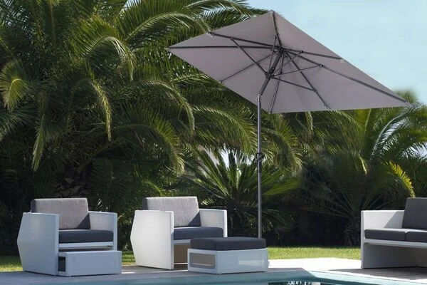 Dieser rechteckige Sonnenschirm ist prima für Balkone geeignet und passt mit seiner dezenten Farbe zu vielen Gartenmöbelstilen.