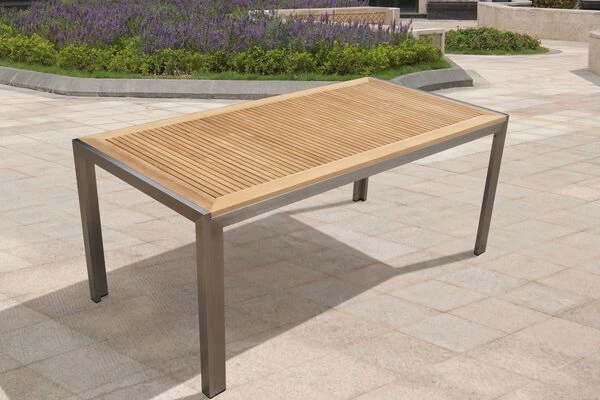 Der Teakholztisch mit seiner ca. 180 x 90 cm großen Tischplatte, bietet genügend Platz für bis zu 6 Personen. Die schlichte Optik dieses Tisches wird durch die Verbindung aus kühlem Edelstahl und Teakholz, in einem warmen Braunton, geprägt. Nicht nur das besondere Design, sondern auch die hochwertige Materialauswahl, beginnend mit dem stabilen Edelstahlrahmen, weiß zu überzeugen. Das FSC®-zertifizierte Teakholz der Tischplatte hat eine einzigartige Maserung und wird Ihren Gästen sicher sofort auffallen.