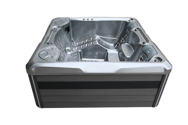OUTTECH® Steel Art – Cetus Whirlpool aus Acryl (Edelstahl-Look)/Compo-Wood/ABS in grau/anthrazit, mit Farbwechsel-LEDs und digitaler Steuerung per LCD-Anzeige, für 4 Personen