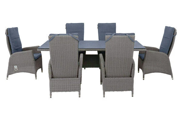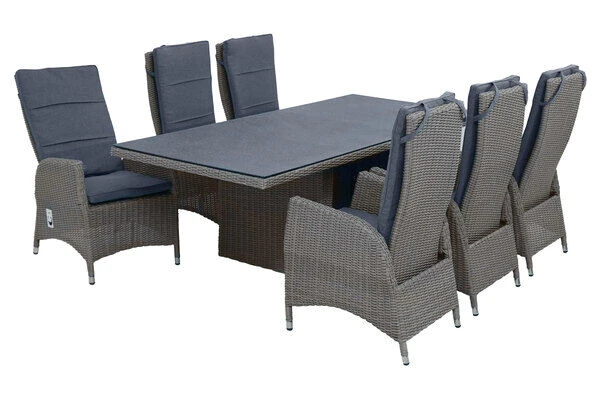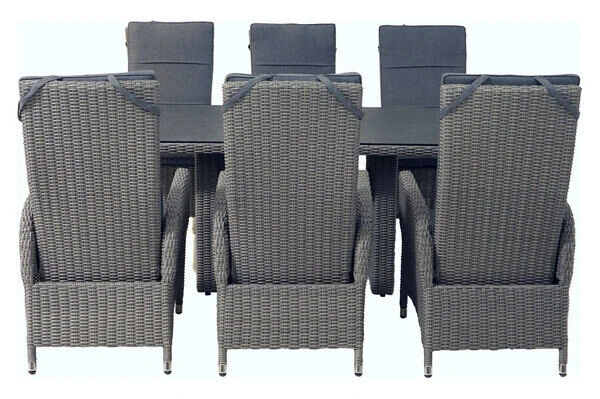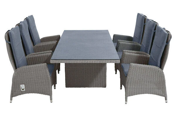Neben den sechs bequemen Sesseln wird ein Tisch (ca. 200 x 95 x 75 cm) mit einer ca. 6 mm starken Spraystone Platte (Glasplatte in Steinoptik) geliefert. Daraus ergibt sich eine wetter- und stoßfeste sowie pflegeleichte Oberfläche in einer eleganten Natursteinoptik, die sich mit einem milden Reiniger und einem Lappen kinderleicht pflegen lässt. Die Unterschubhöhe des Tisches beträgt ca. 69 cm.