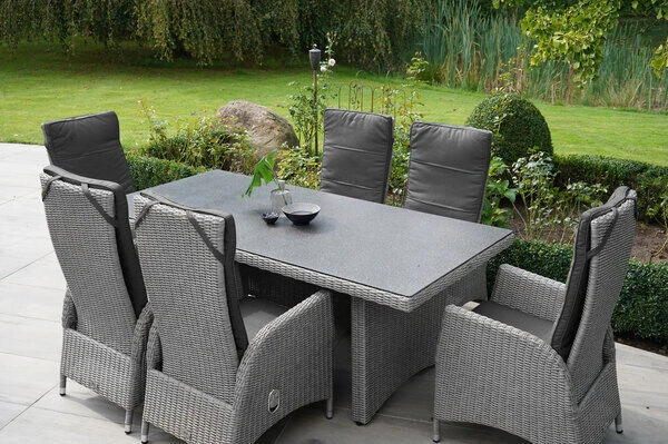 Hochwertige Polyrattan Esstischgarnitur Vigo für 6 Personen, stahlgrau-meliert/schiefergrau