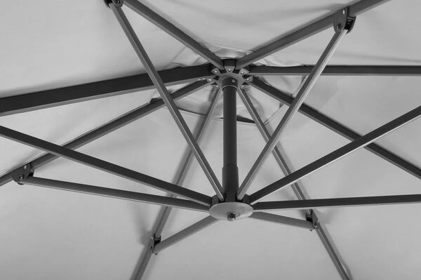 Der Ampelschirm Rhodos Twist besitzt einen genormten 50+ UV-Schutz nach Standard AS/NZS4399:1996. Die Belüftungsöffnung am oberen Ende vom Schirm – das sogenannte Air-Vent – dient der Luftzirkulation und sorgt dafür, dass warme Luft nach oben entweichen kann.