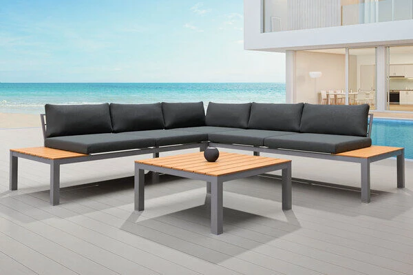 Dank der dunkelgrauen Sitz- und Polsterkissen, liefert Ihnen die stilvolle Loungegarnitur von Villana den optimalen Komfort für schöne Momente im eigenen Garten. Die Loungegruppe besteht aus einer Ecklounge und einem Loungetisch. Die Lounge hat eine Größe von ca. 245 x 245 x 75 cm und wiegt ca. 64 kg. Das Gestell der Loungemöbel besteht aus pulverbeschichtetem Aluminium. Aluminium ist ein sehr leichtes Metall, so dass Ihre Loungegarnitur stabil aber beweglich bleibt. Darüber hinaus besitzt Aluminium eine gute Korrosionsbeständigkeit, was zu einer langen Lebensdauer Ihrer Gartenmöbel führt. Loungegarnituren aus Aluminium können Sie unbesorgt das ganze Jahr über im Freien stehen lassen. Das Material ist witterungsbeständig und trotzt so gutem wie auch schlechtem Wetter. Zudem erleichtert es die Pflege Ihrer Gartenmöbel, da sich Verunreinigungen durch den Einsatz von Wasser schnell und unkompliziert entfernen lassen. Als zusätzliche Ablagefläche befinden sich an den beiden Enden dieser Lounge jeweils eine Seitenablage aus einem Kunststoff-Holzimitat. Diese Seitenablagen haben die Maße von ca. 30 x 80 cm und bestehen aus 8 Kunststoffstreben. Die Ecklounge bietet genügend Platz für bis zu fünf Personen – so findet jedes Familienmitglied seinen Lieblingsplatz. Die Loungemöbelpolster sind mit einem Bezug aus 100% Polyester in einem unaufdringlichen dunkelgrau überzogen. Die Rückenposter und Sitzkissen haben jeweils eine Dicke von ca. 10 cm und sind abnehmbar.